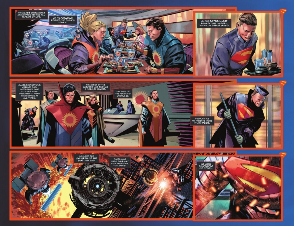 Aquí, Jor-El y Lara siguen siendo tan inteligentes e insurrectos como siempre, pero a diferencia de las demás versiones, su espíritu rebelde y revolucionario se manifiesta mucho antes de la destrucción de Krypton, por lo que son expulsados de la clase dominante de Krypton y obligados a ser parte de la clase trabajadora – las Personas de Acero, la cual es representada por el emblema de la «S», que ambos portan con orgullo. De todos los origines y trasfondos que se le han dado a la «S», esta es la que más se acerca al ethos de «Campeon de los Oprimidos» que sus creadores le dieron a Superman en 1938.