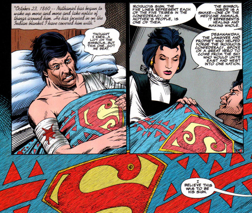 La primera es de The Kents #4, de John Ostrander, en la que un antepasado de Jonathan Kent se encuentra herido y su futura esposa le presenta una cobija con el símbolo bordado: