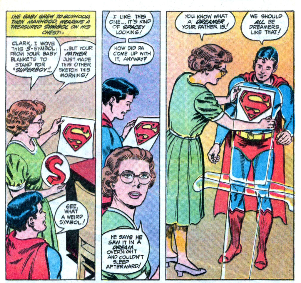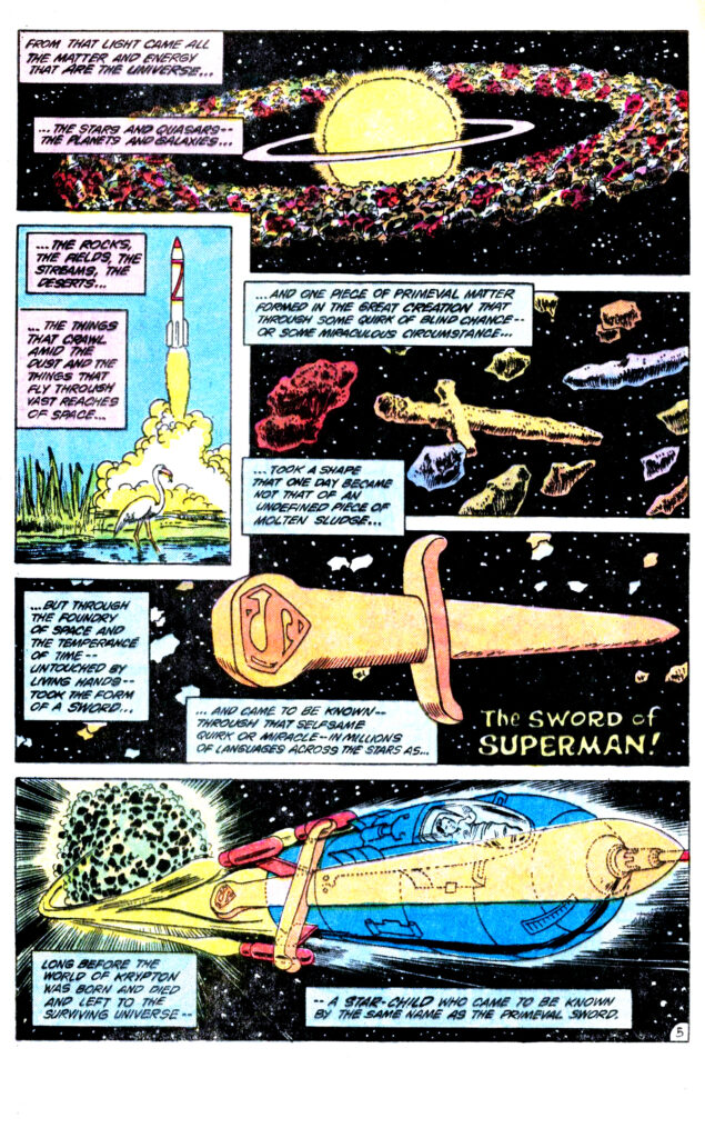 The Sword of Superman, una historia escrita por Elliot S! Maggin para Superman Annual #10, nos da un origen más..esotérico de la «S». Es el símbolo es la mencionada Espada de Superman, que existe desde el inicio de los tiempos y es parte del universo y del Creador: